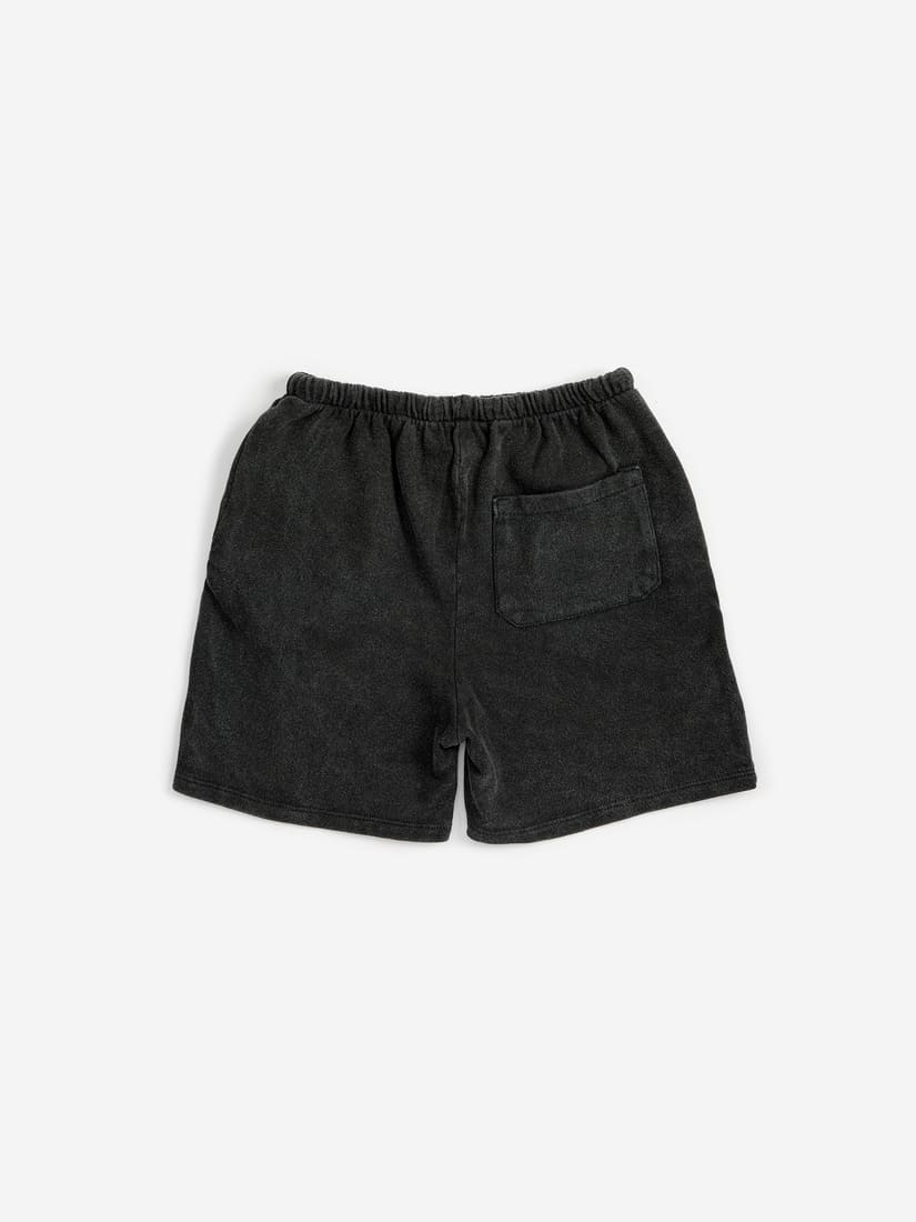 100% organic cotton dark grey bermuda shorts. Designed with regular crotch, adjustable waistband, elasticated waistband, regular, over knee length, seam pocket and fleece. It has a loose fit. Made in Spain