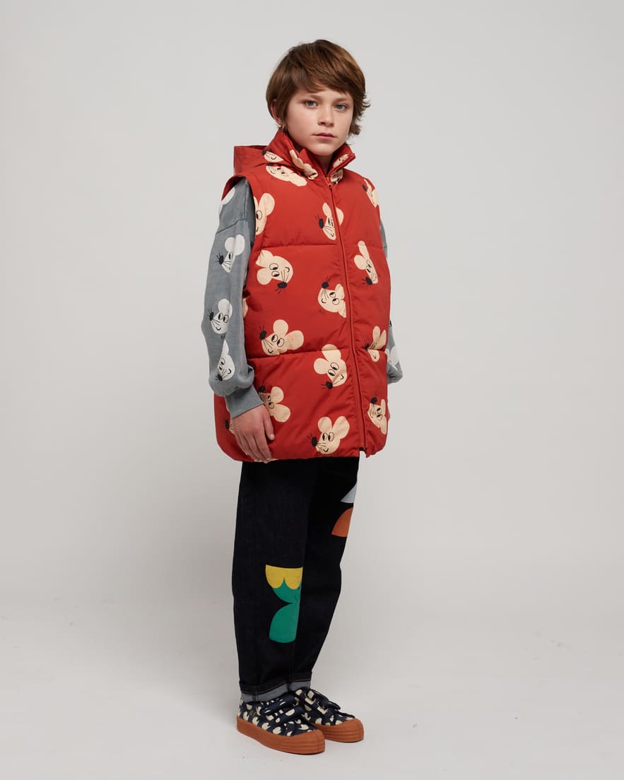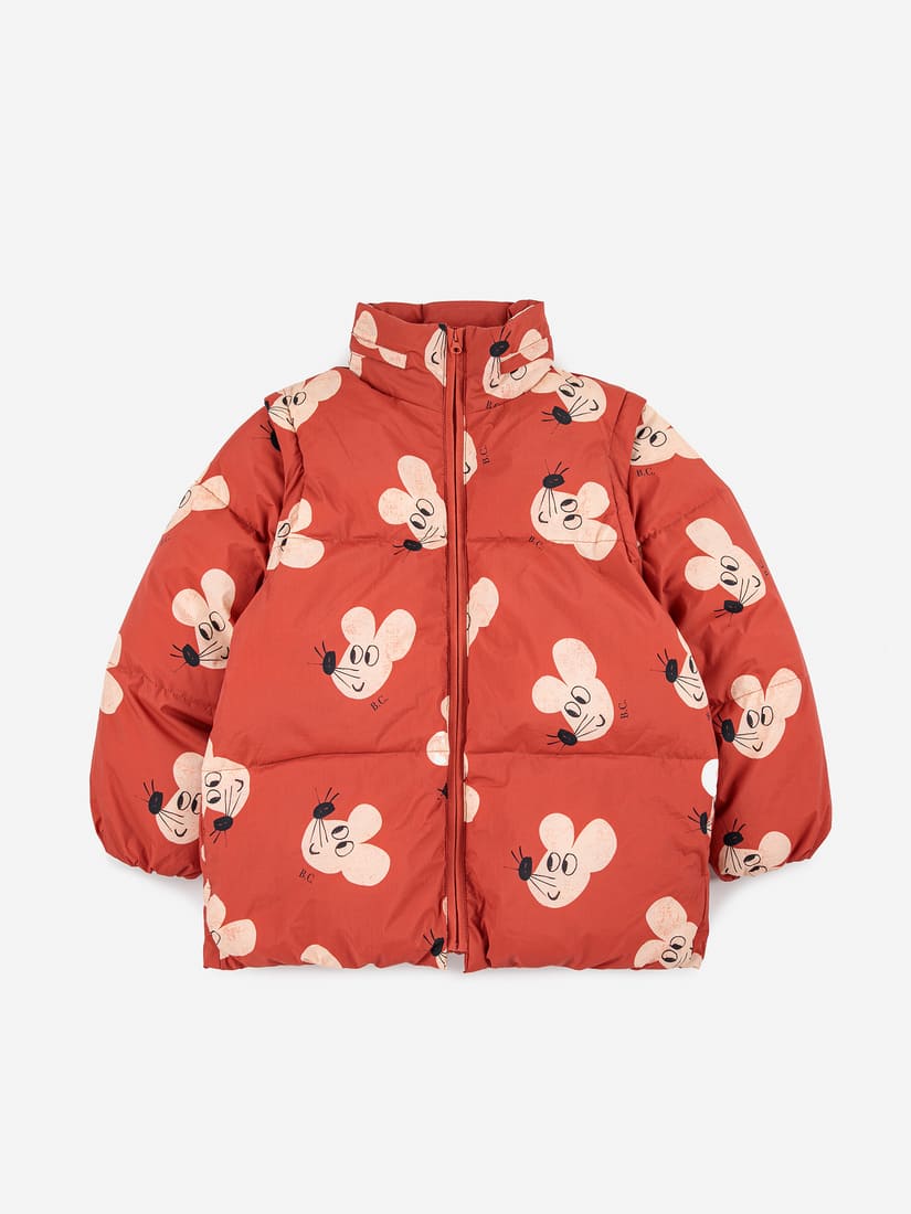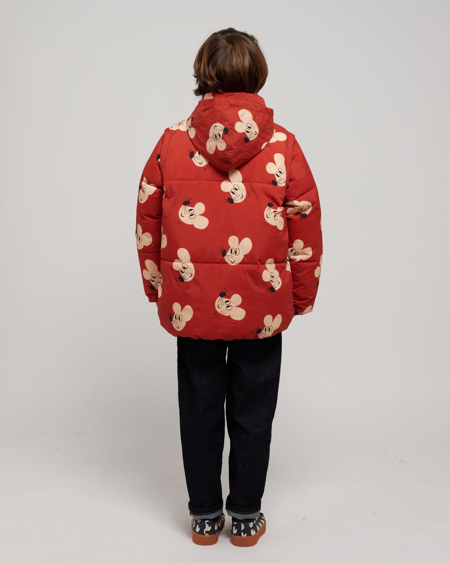 Bobo Choses toppatakki, josta saa myös kätevästi liivin. Takissa on sievä hiirikuosi. Hihat kiinnitetään vetoketjuilla. Takin väri on tiilenpunainen. Takissa on huppu, jonka saa piiloon kaulukseen. Sivusaumoissa taskut.