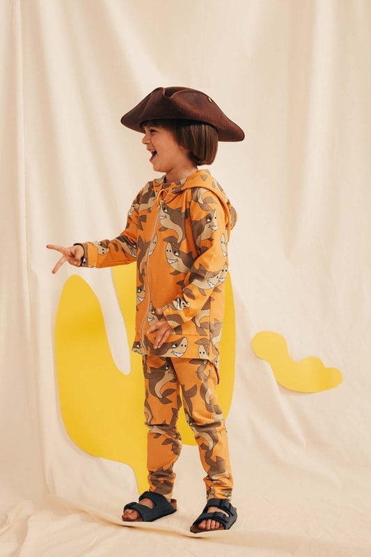 Dear Sophie ihastuttava hai huppari. Hupparin pohjaväri on raikas oranssi. Edessä nikkelivapaa vetoketju.