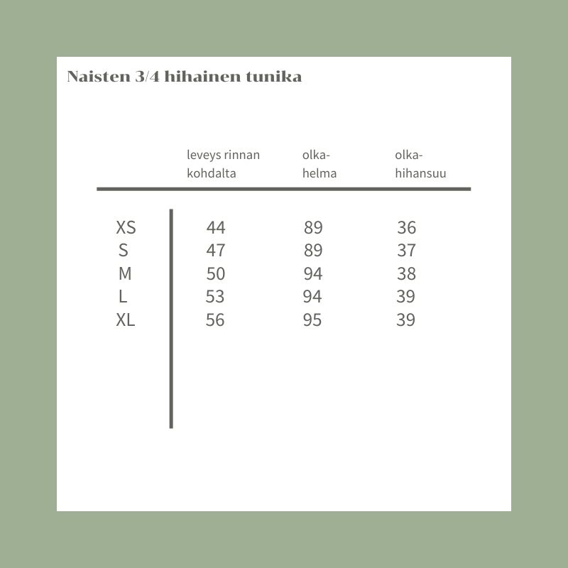 Ihkan naisten tunika on valmistettu laadukkaasta luomupuuvillatrikoosta. Tunikassa on ¾-hihat ja avara pääntie sekä edessä että takana. Malliltaan tunika on hieman A-linjainen ja rento. Jokaisessa naisten tunikassa printin kohdistus on yksilöllinen. Tunika on suunniteltu ja valmistettu Suomessa ja tuotteelle on myönnetty Avainlippu. Kankaan kuosin on Ihkalle suunnitellut Nora Bisi ja se on painettu Euroopassa GOTS sertifioidulle pohjakankaalle.