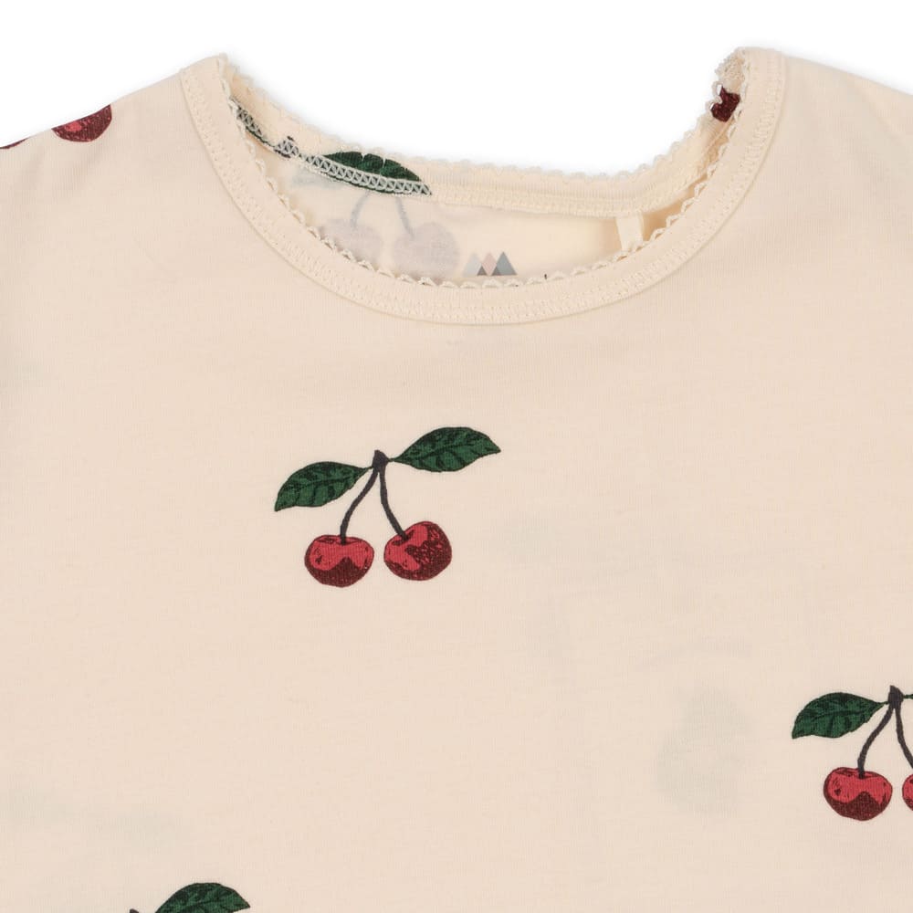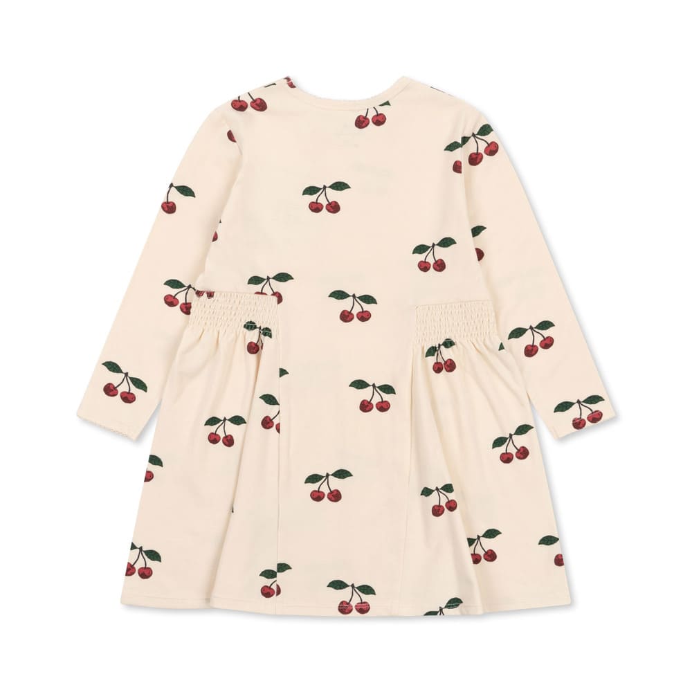 Konges Slojd suloinen trikoomekko. Mekossa on herkulliset kirsikat. Vyötäisillä kuminauha tuomassa mekolle kauniin istuvuuden ja helman laskeutumisen. Mekko on valmistettu pehmeästä luomupuuvillaisesta trikoosta.