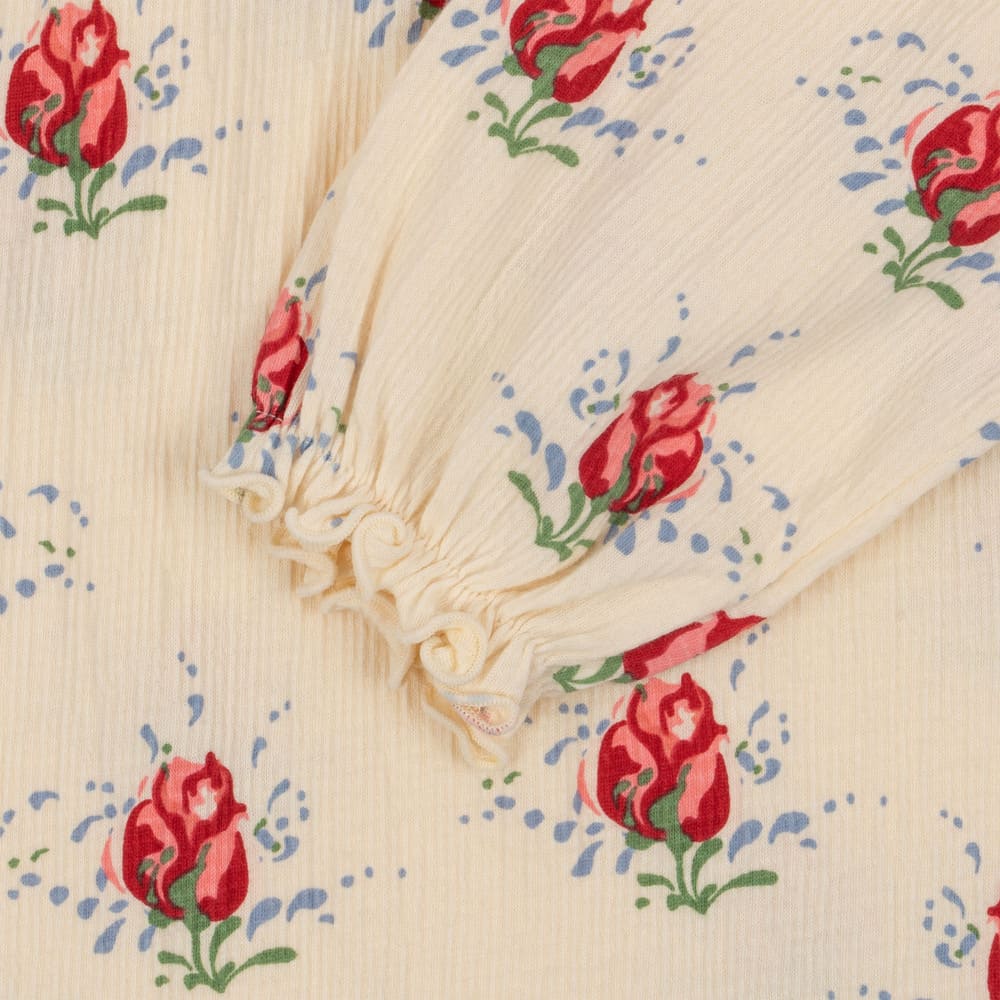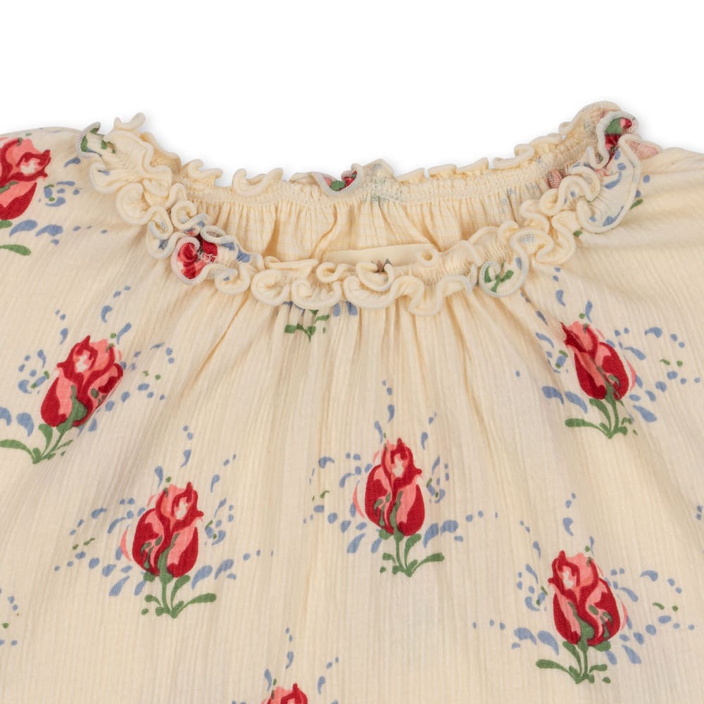 Konges Slojd suloinen body ruusu printillä. Bodyssa on sievä rypytetty pääntie, hihansuut sekä jalka-aukot. Pukeutumista ja vaipanvaihtoa varten nepparit helpottamassa vauvan hoitoa.
