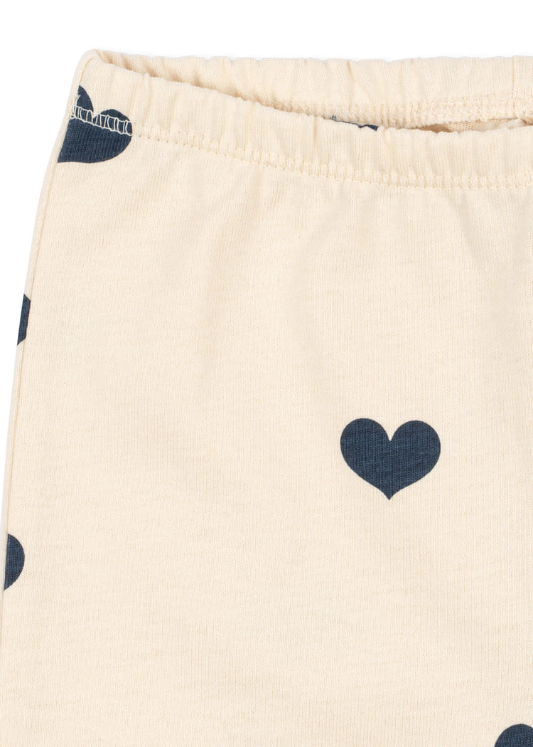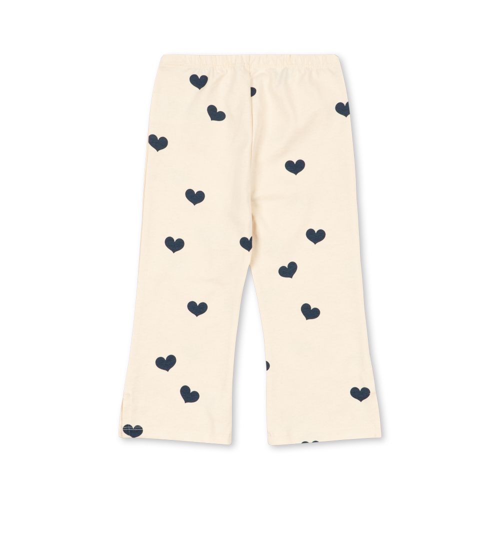 Konges Slojd napakasta trikoosta valmistetut housut. Housuissa on ihastuttavat mustat sydämet ja housujen pohjaväri on ivory. Vyötäisillä kuminauha.