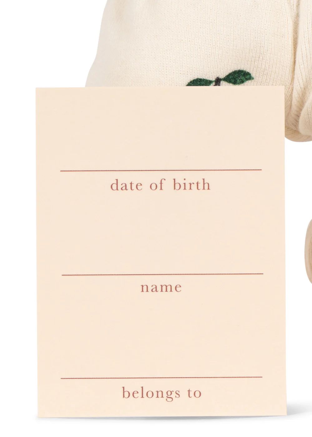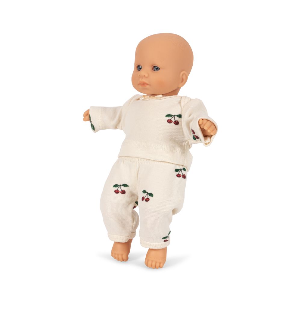 Kaikki materiaalit on valittu huolellisesti ja tuote on testattu eurooppalaisten turvallisuusstandardien mukaisesti turvallisten leikkien takaamiseksi. Pehmeä ja söpö nuken paita ja housut on valmistettu luomupuuvillasta.