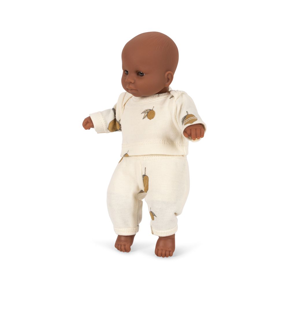Kaikki materiaalit on valittu huolellisesti ja tuote on testattu eurooppalaisten turvallisuusstandardien mukaisesti turvallisten leikkien takaamiseksi. Pehmeä ja söpö nuken paita ja housut on valmistettu luomupuuvillasta.