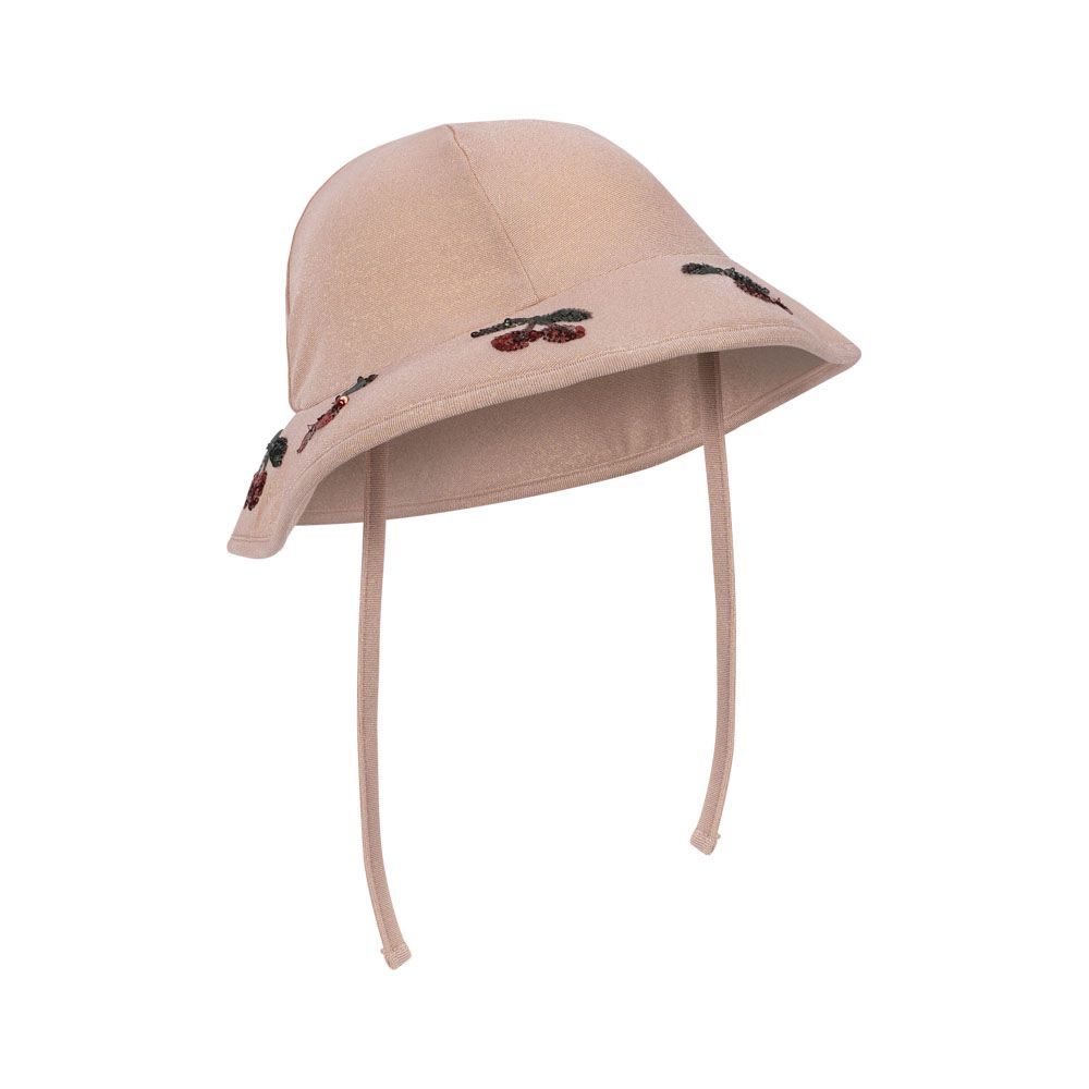 Konges Slojd suloinen aurinkohattu pienelle lapselle kesän aurinkoisiin päiviin ja rannalle. Hatun pehmustettu lieri suojaa lapsen kasvoja ja niskaa auringon säteiltä. Hattu on hieman roosaan taittava hiekka sävyltään ja kankaaseen on kudottu hento kimalle. Lieriä somistaa paljeteista tehdyt kirsikat.