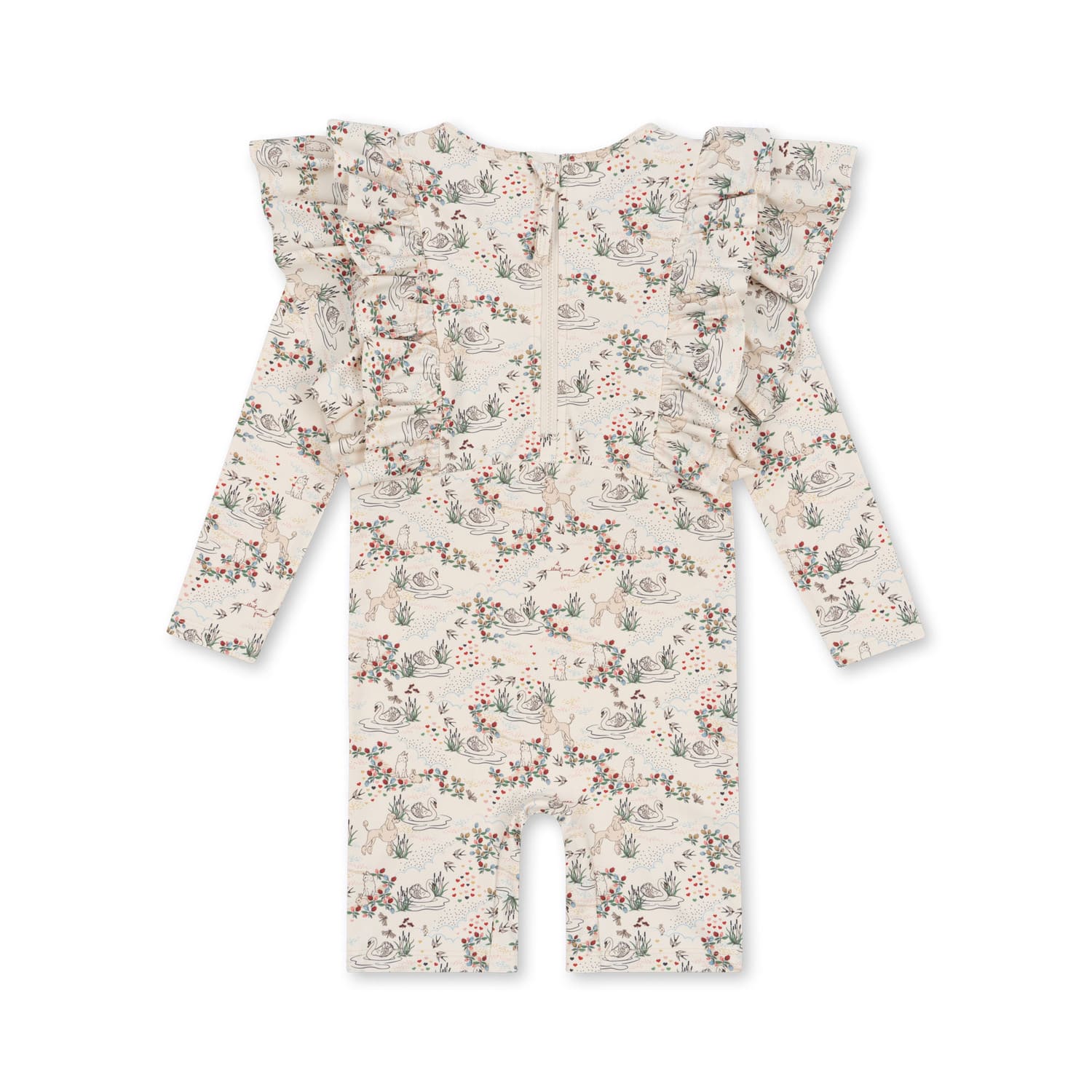 Konges Slojd sievä uv-suojattu uimahaalari, jossa on joutsenia, puudeleita ja kissoja lammella kesäpäivänä.  Haalarissa on edessä frillat. Tämä sievä UV-uintihaalari suojaa lapsesi auringon säteiltä ja on ilo silmälle. Haalari on valmistettu UV-suojatusta uimapukukankaasta, joten se helpottaa rannalla rasvaamisen kanssa. Uimisen jälkeen haalari kuivuu nopeasti ja on mukava käytössä rannalla leikkiessä.