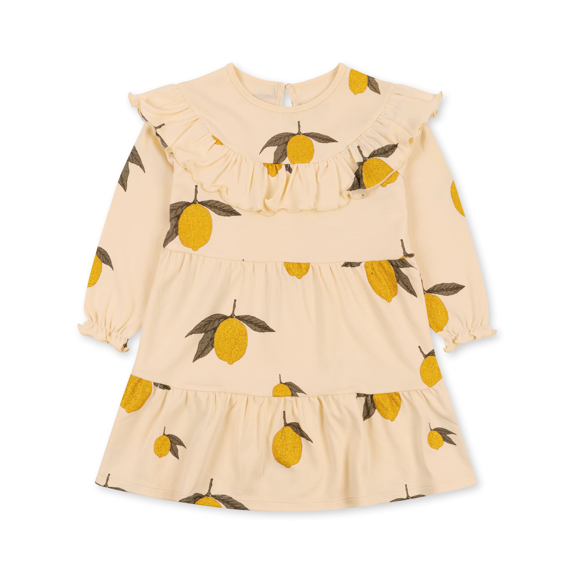 Konges Slojd sievä mekko sitruunoin, joissa on kimalletta. Tämä mekko on kaunis niin arkeen kuin juhlaan. Yhdistä neuleisiin ja sukkahousuihin ja sievä asu on valmis.