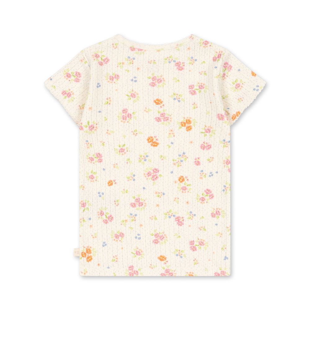 Konges Slojd pehmeästä luomupuuvillaisesta trikoosta valmistettu T-paita. Paidan pohjaväri on heleä kermanvaalea ja siinä on suloisia pastellisia kukkia sekä pilkkuja.