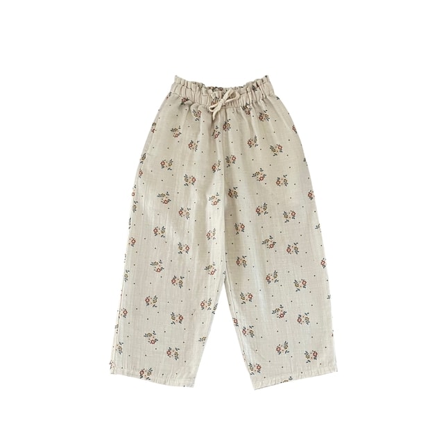 Liilu kauniit kangashousut sievällä kukkakuosilla. Joustava vyötärö, jossa nyöri. Sivusaumassa taskut pienen aarteille. Ihana, kevyt ja pehmeä puuvillamusliinikangas.