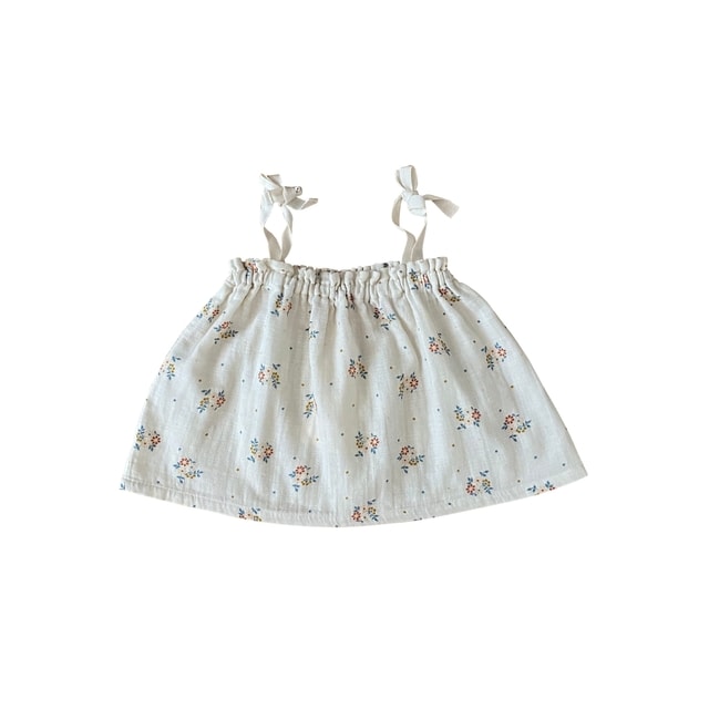 Liilu suloinen kermanvaalea toppi sievällä kukkakuosilla. Pääntiellä on sievä joustava rypytys, spagetti säädettävät olkaimet. Paita on valmistettu ihanan pehmeästä musliinikankaasta. Väljä mitoitus.
