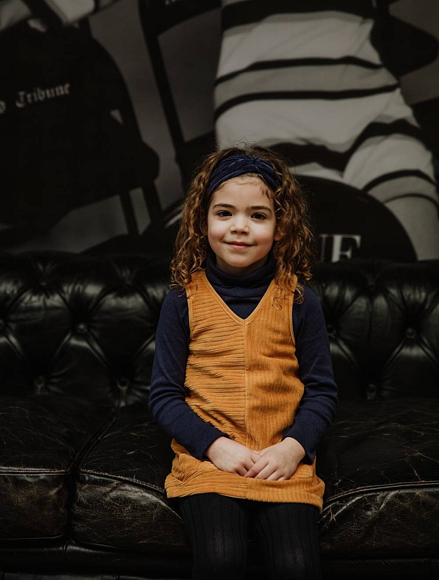 Pinafore dress. In the different variaties  of the most fantastic fabrics. Shiny Peluche, Rib and the softest sweat.  To wear over a long sleeve or turtle neck. Combined with one of our beautiful tights! We used not only organic cotton, but also recycled material for this style. We try to re-use ‘garbage’ material to the maximum to take care of our world.
