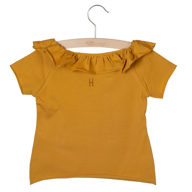Little Hedonist pehmeä trikoopaita upeassa amber gold -sävyssä. Basic -mallisessa paidassa on ihastuttava frilla pääntiellä. Miellyttävä ja chic jokaiseen lapsen päivään.