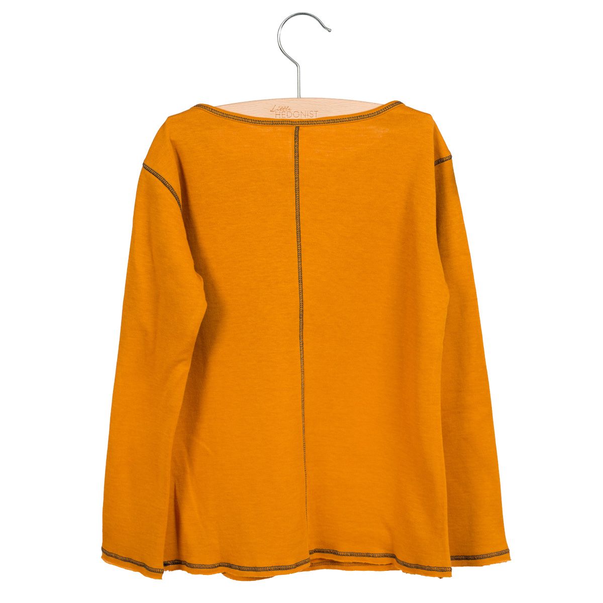 Little Hedonist pehmeä trikoopaita oranssin vivahteisena keltaisena. Pirate black tikkaukset.