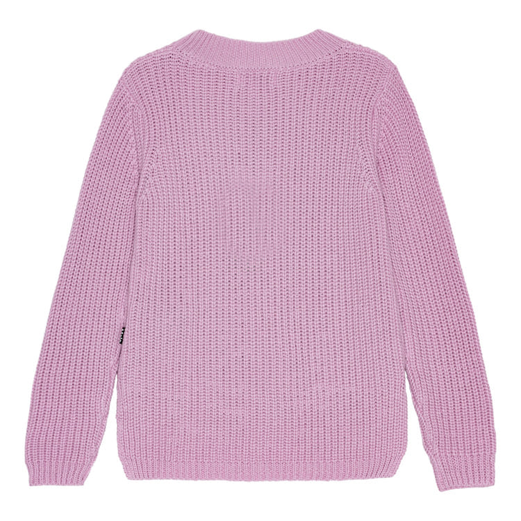 Molo Kids ihanan rento puuvillainen neulepaita laventelin sävyssä, pink lavender. Neulos on mukavan muhkea ja sopii hyvin yhteen erilaisten mekkojen, hameiden ja housujen kanssa.