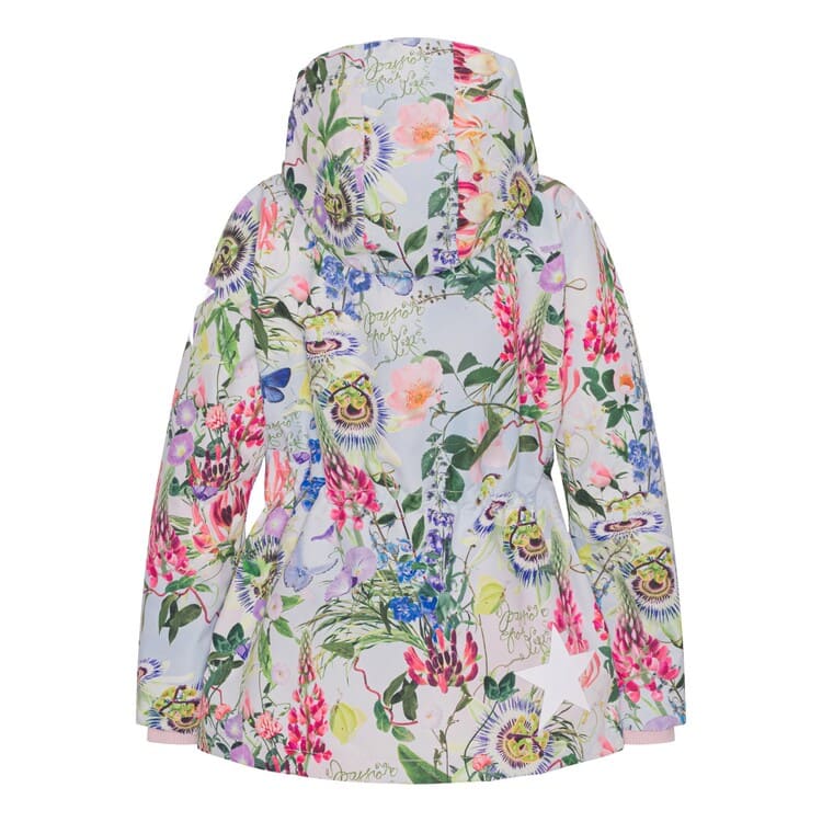 Molo Kids kaunis hieman pidemmän mallinen välikausitakki kauniilla kukkakuosilla. Takissa on irrotettava huppu sekä runsaasti heijastimia. Kangasvuori.  Takin hyvä leikkaus takaa takin kauniin istuvuuden myös hoikalle lapselle. Molo Kids ulkoiluvaatteissa on markkinoiden parhaat heijastimet tuomassa lapselle turvallisuutta.