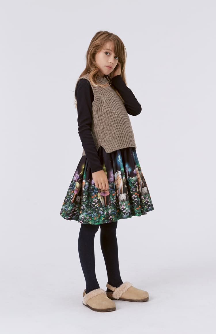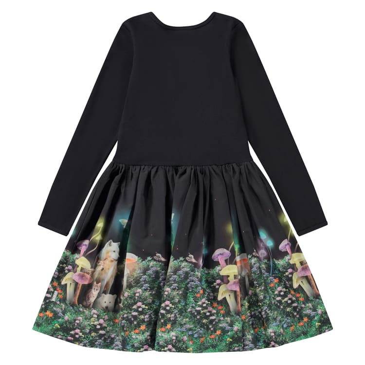 Satumaisen kaunis Molo Kids mekko, jossa metsän eläimet; bambi, jääkarhu ja pöllö ystävineen ovat metsässä sienten ympäröimänä.