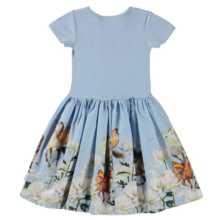 Molo Kids kaunis mekko arkeen ja juhlaan. Mekon yläosa on pehmeää ribbtrikoota ja helma puuvillakangasta. Helmassa on hevoset lentävät perhosten siivin kukkien joukossa. Materiaali 100% luomupuuvilla