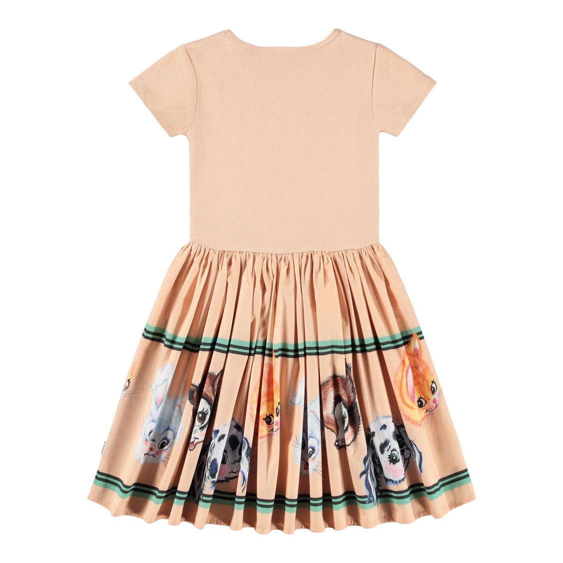 Molo Kids kaunis mekko arkeen ja juhlaan. Mekon yläosa on pehmeää ribbtrikoota ja helma puuvillakangasta. Helmassa suloisia eläimiä.