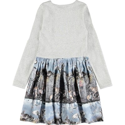 Molo Kids kaunis trikoo mekko. Yläosa on harmaameleerattua ribbtrikoota ja helmassa on kaunis metsä -kuosi, jossa mm. puput ja ketut seikkailevat.