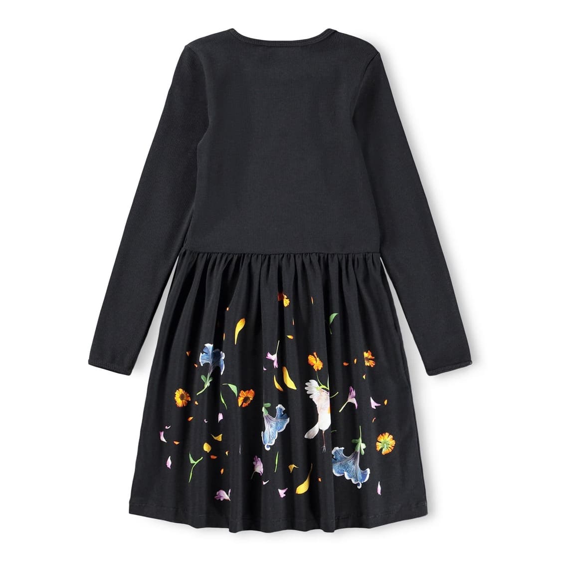 Molo Kids kaunis trikoo mekko, jossa kissa tepastelee kukkien joukossa. Yläosa on pehmeää ribbtrikoota ja helma puuvillakangasta. Mekko on kiva niin arkeen kuin juhlaan.