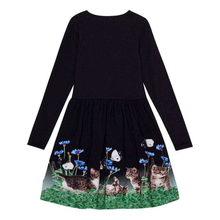 Molo Kids kaunis trikoo mekko, jossa kissapennut leikkivät kukkaniityllä. Yläosa on pehmeää ribbtrikoota ja helma puuvillakangasta.  Mekko on kiva niin arkeen kuin juhlaan.