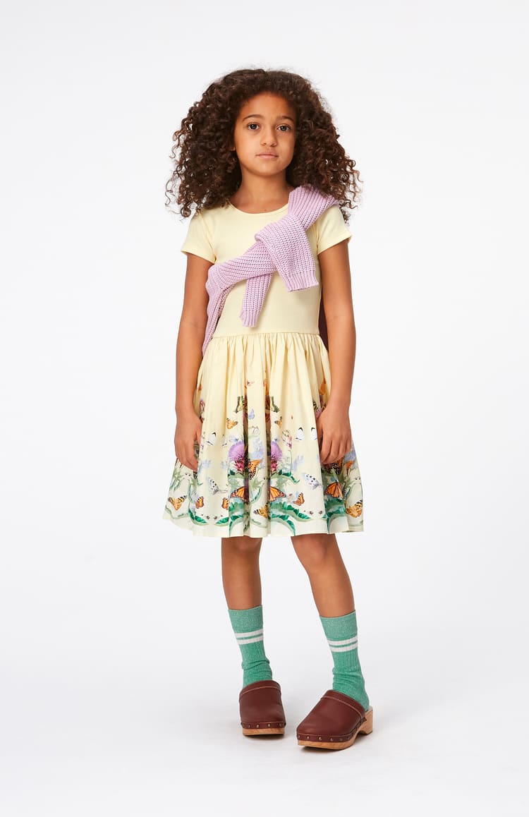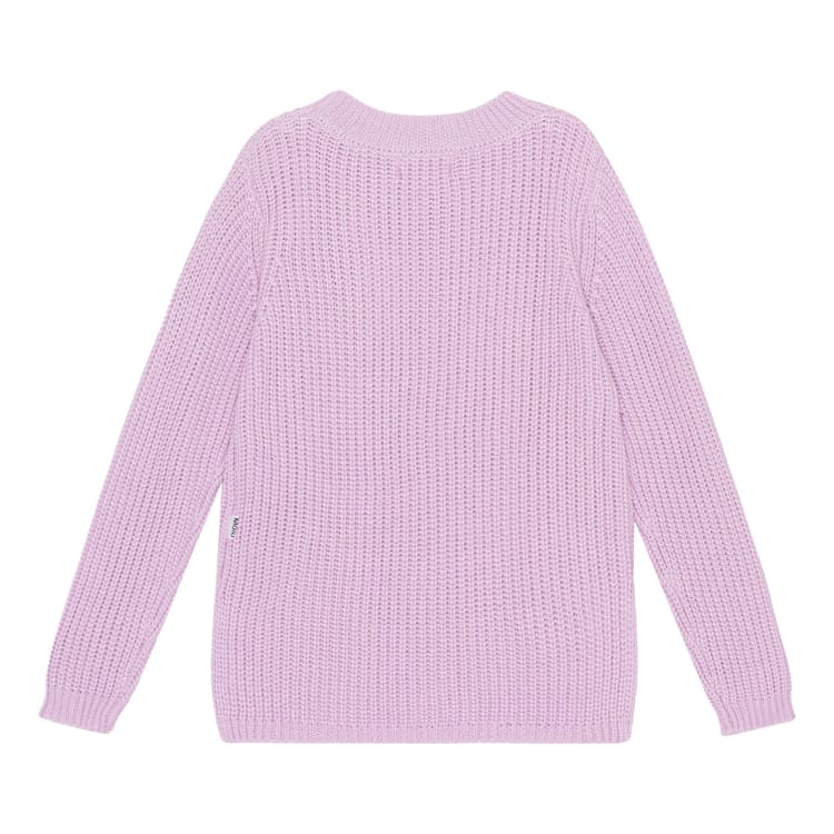 Molo Kids ihanan rento puuvillainen neulepaita laventelin sävyssä, alpine glow. Neulos on mukavan muhkea ja sopii hyvin yhteen erilaisten mekkojen, hameiden ja housujen kanssa.
