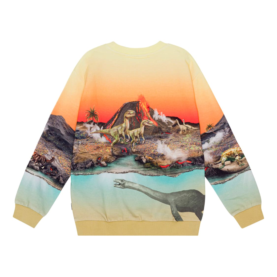 Molo Kids upea collegepaita hienolla printillä, jossa dinosaurukset ovat tulivuoren ympärillä.