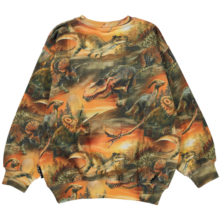 Molo Kids dinosaurus collegepaita upeine sävyineen. Collegen nurjapuoli on harjattu pehmeäksi.