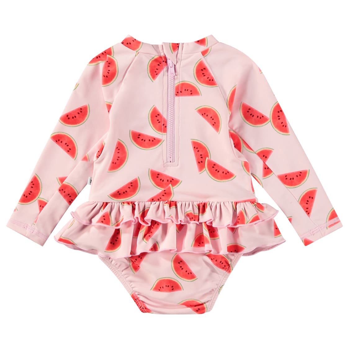 Molo Kids kaunis uimapuku frilloin Uimapuku on UV-suojattu, UPF 50+. Uimapuvussa on vetoketju takana ja napit haarassa, joten vaipan vaihto pienokaiselle on helppoa. Reisien ympärillä on kuminauha ja uimapuvussa on vuorattu alaosa, jossa tilaa vaippalle. Uimapuvun pitkät raglanhihat suojaavat pienokaisen käsiä auringonpaisteelta.. Uimapuku on vaaleanpunainen ja siinä on vesimeloneja.