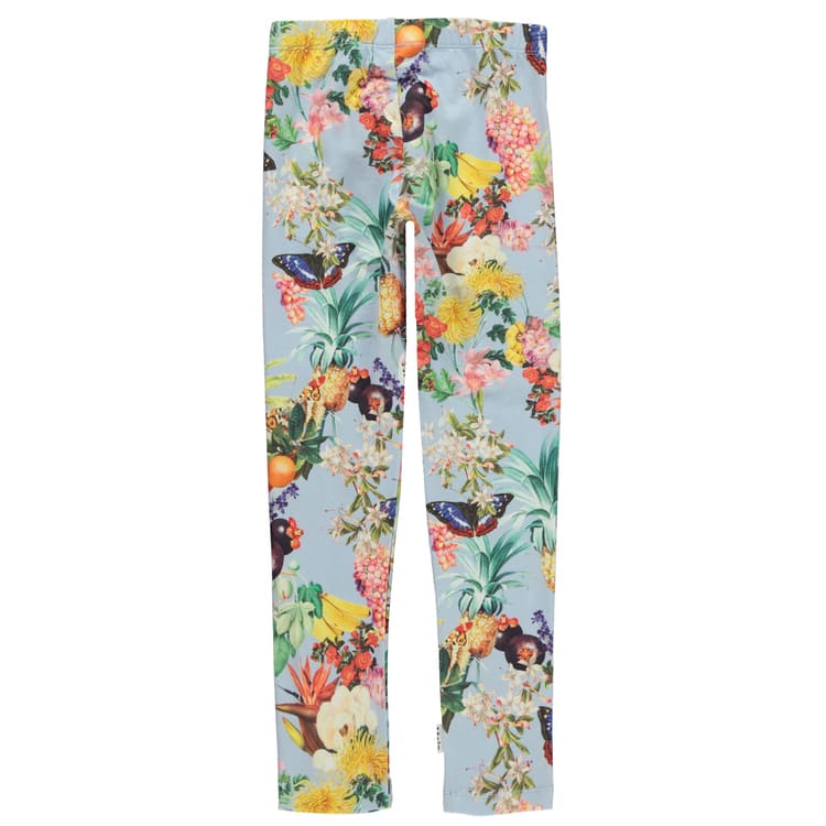 Molo Kids kauniit leggingsit, joissa on kukkia, hedelmiä ja perhosia. Leggingsien pohjaväri on sinisävyinen.