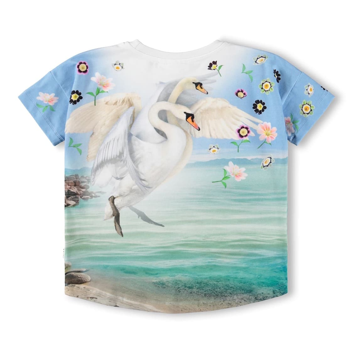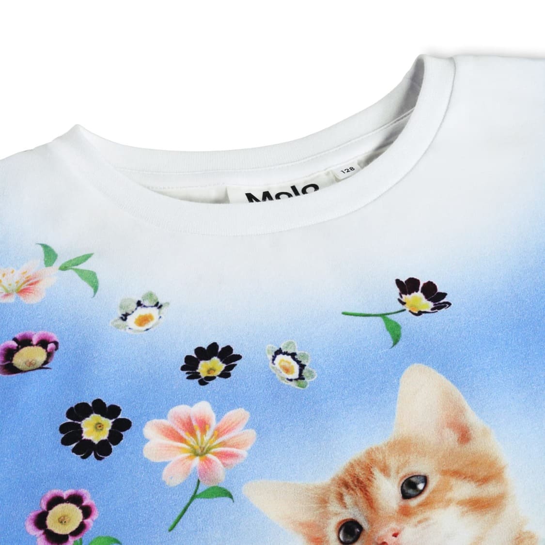 Molo Kids kaunis t-paita, jossa kissa purjehtii simpukalla merellä kukkasateessa haaveillen.