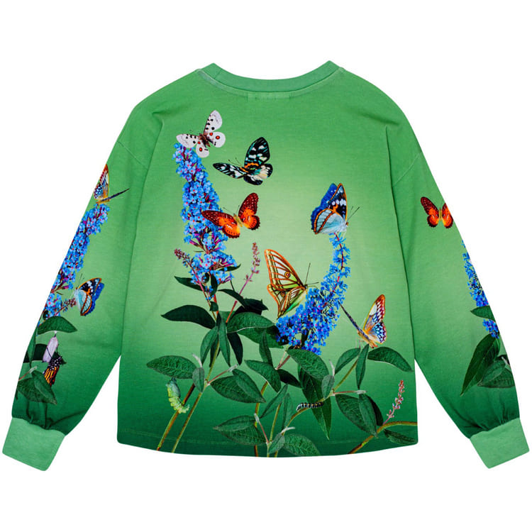 Molo Kids upea paita, jossa perhoset pörräävät kukkasissa. Tässä paidassa on todella upeat vihreän sävyt!