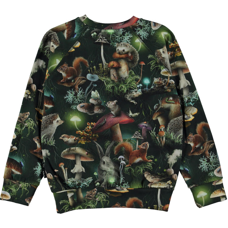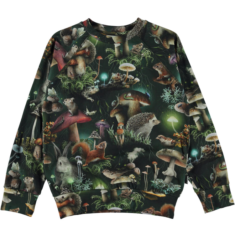 Molo Kids makea lasten paita, jossa on satumaisen kaunis kuosi. Paidassa metsän eläimet; orava, pupu, hiiri ja siili kumppaneineen viettävät hetkeään kauniissa metsässä sienien ympäröimänä.