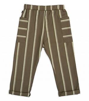 Monkind hienot housut arkeen ja juhlaan. Sivutaskut. Vyötäröllä joustava kuminauha. Housut ovat sammalenvihreää kangasta vaalein raidoin. Valmistettu pehmeästä puuvillakankaasta.