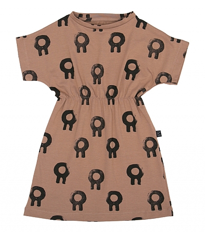 Monkind ihanan pehmeä trikoomekko. Pohjaväri lämmin ruskea, mustalla kuviolla. Mekon vyötäisillä on kuminauha.