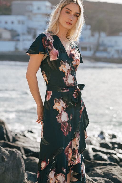 Annika mekon valekietaisumalli ja eri tavoin solmittava vyötärönauha varmistavat istuvuuden jokaiselle vartalolle ja imartelevat muotoleikkaukset luovat kauniin siluetin korostaen juuri oikeita kohtia. Mekon helmassa ja hihoissa toistuvat hulmuavat, aaltoilevat muotolaskokset laskeutuvat kevyellä kankaalla kauniisti ja vievät mielen seikkailuihin Etelä-Euroopan mukulakivisille pikkukujille tai mikäpä on kävellessä rannalla helmat hulmuten veden liplatellessa varpaita.