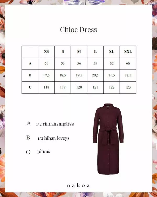 Nakoan Chloe Dress kestää hyvin aikaa ja sama koko sopii monenlaisille vartaloille. Mekko sopii hyvin istuvampaan sekä rennompaan tyyliin. Katso apua koon valintaan suuntaa antavasta mittataulukosta tai ota yhteyttä asiakaspalveluun!