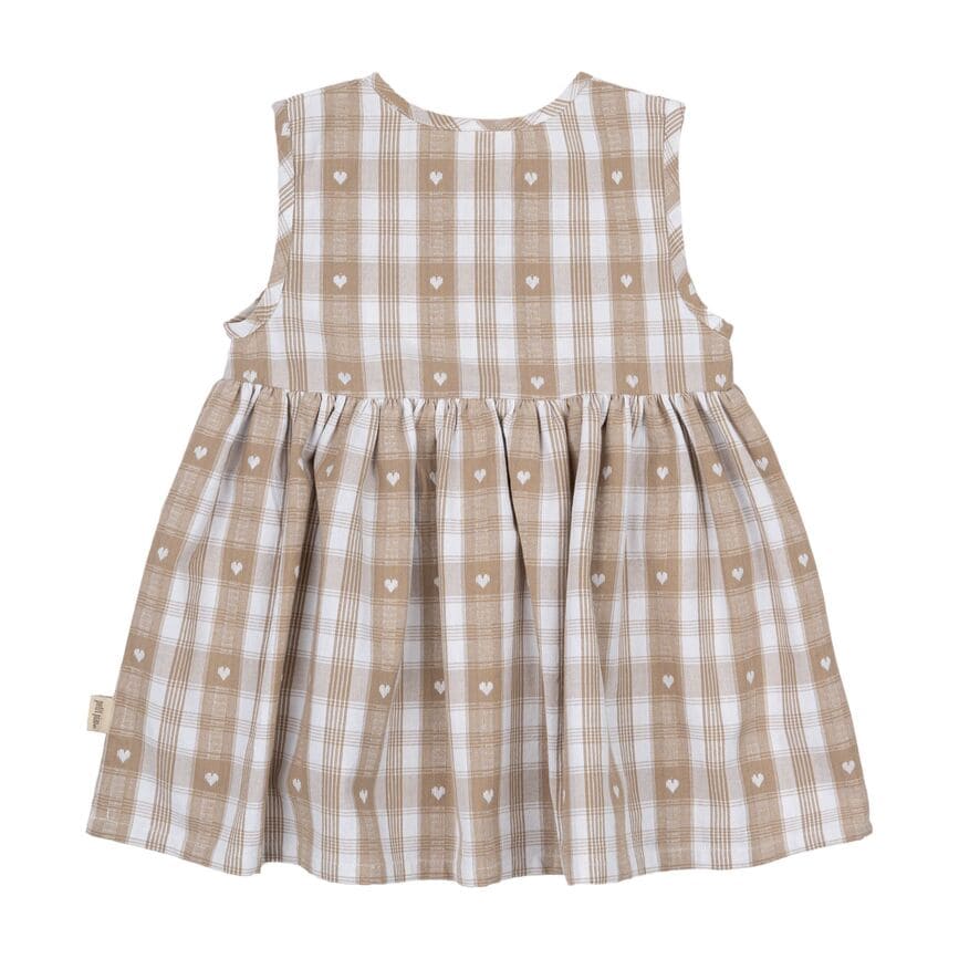 Petit Piao hurmaava ruutukuosillinen mekko, jota somistaa suloiset sydämet. Mekossa on edessä taskut, joita somistaa kauniit napit. Mekko on väriltään off white ja hiekka.