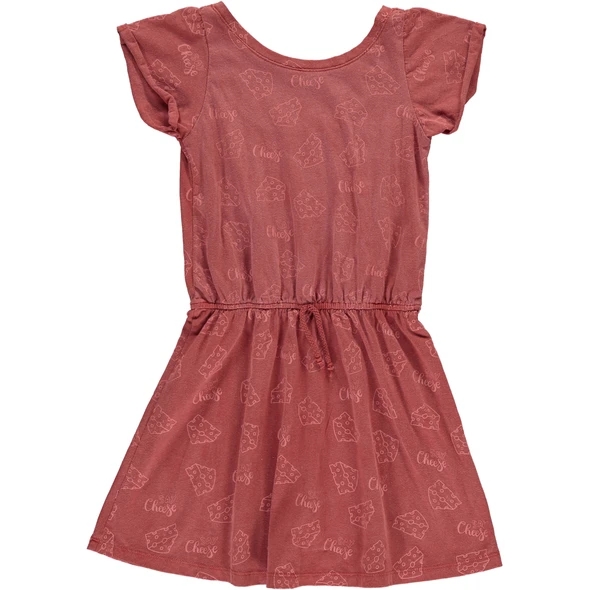 Pinata Pum sievä mekko juusto printillä. Vyötäisillä nyöri. Mekon väri on hieman ruosteenpunaiseen taittava murrettu punaisen sävy.