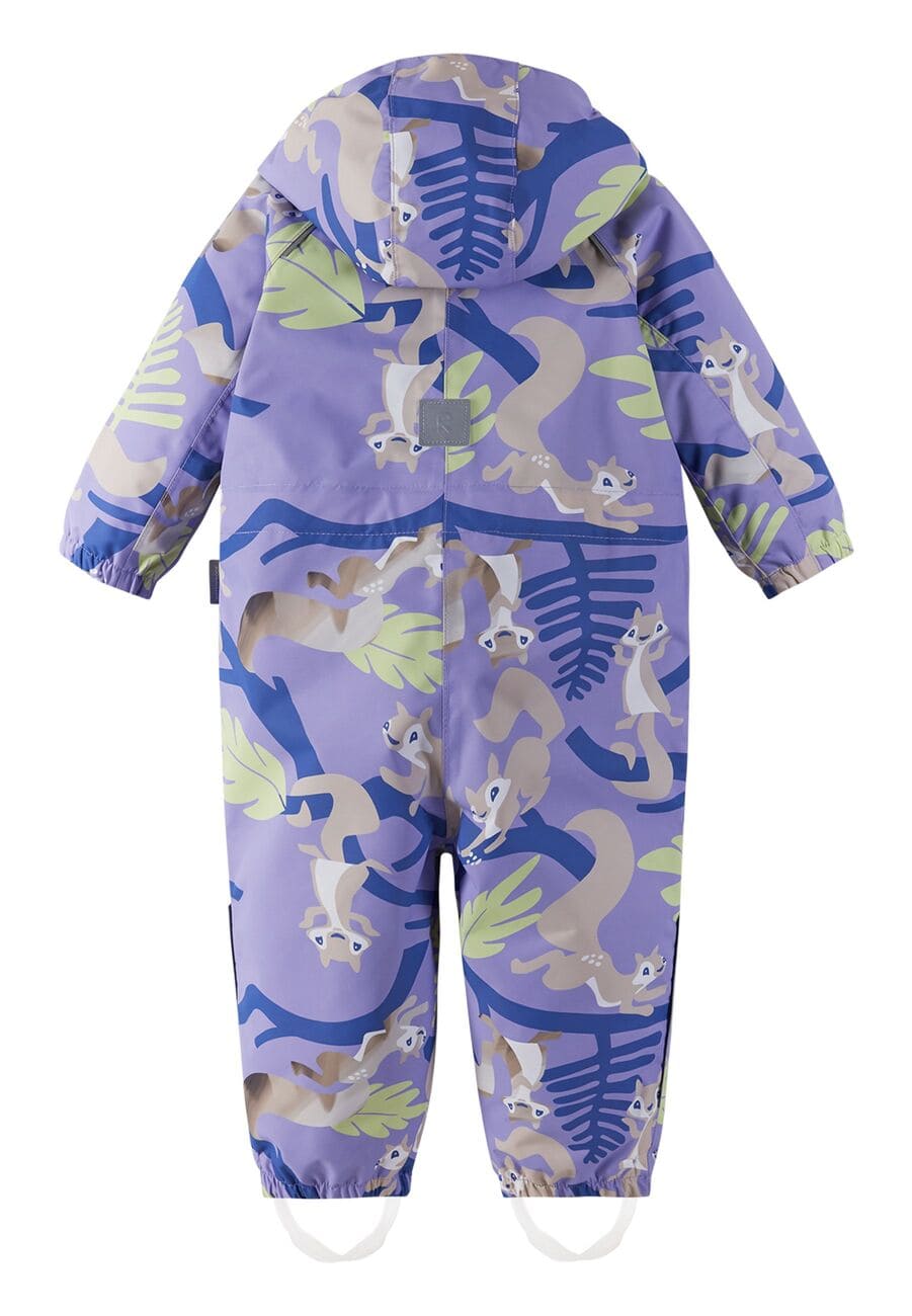 Reima Reimatec välikausihaalari kauniilla lilan sävyisellä kuosilla, jossa oravat hyppelehtivät iloisesti.