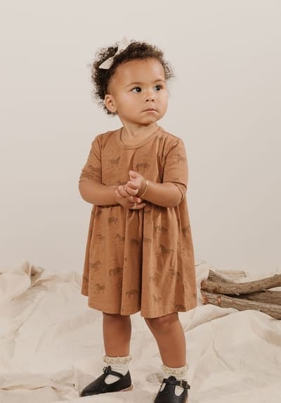 Rylee + Cru ihastuttava trikoinen mekko kauniilla heppa -kuosilla. Väri ruskea.