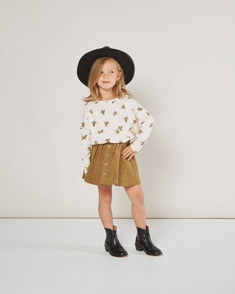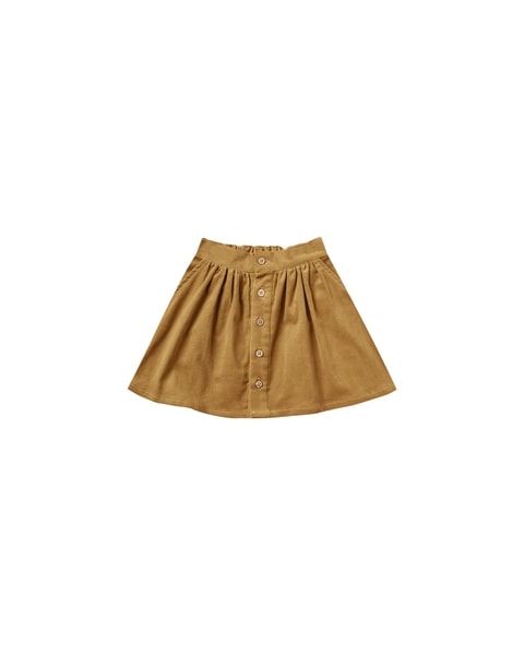Rylee + Cru hieno samettinen hame arkeen ja juhlaan. Hameessa on edessä kauniit napit. Takana vyötäröllä joustava kuminauha. Väri upea goldenrot, joka on hieman kultaan vivahtava vaaleahko ruskea. Hame on pehmeää, kapeaa vakosamettia ja joustaa hyvin. Oikein miellyttävä lapsen käyttää. Sopii hyvin neuleiden ja erilaisten paitojen kanssa käytettäväksi. Yhdistele ja leikittele - nauti!