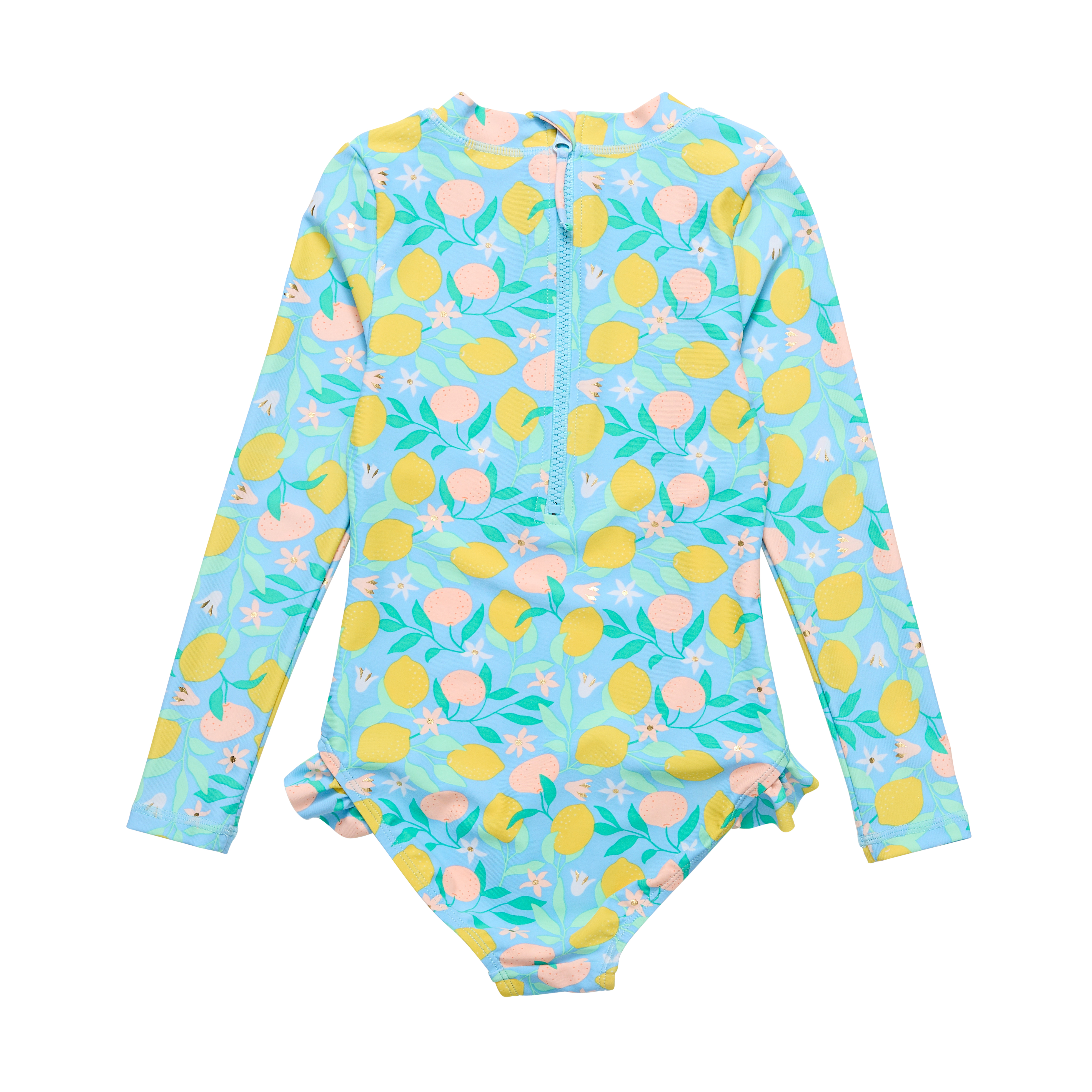 Snapper Rock uv-suojattu hihallinen uimapuku sitruunoin. Takana vetoketju.  Tämä hieno uimapuku suojaa lapsesi auringon säteiltä ja on ilo silmälle. Uimapuku on valmistettu UV-suojatusta uimapukukankaasta ja tämä kuivuu nopeasti.  Vuorattu.