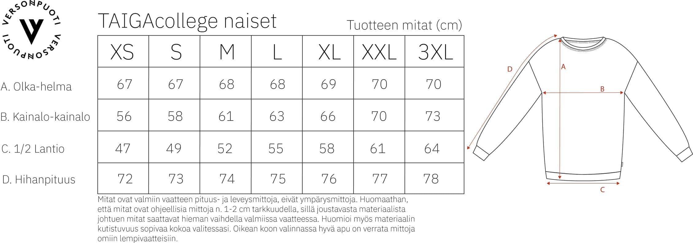 Taiga college on naisten väljä, oversize-henkinen collegepaita pyöreällä pääntiellä ja alaslasketuilla hihoilla. Rennon collarin hihansuissa ja helmassa on käytännölliset resorit.