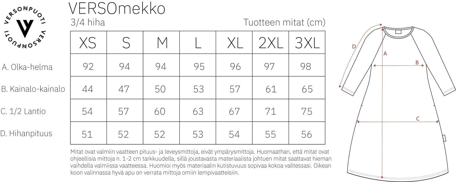 Verso mekko on kaunis, a-linjainen trikoomekko, jossa on hyvin istuvat 3/4-pituiset raglanhihat. Mekon helma kellottuu kauniisti. Verso mekkoa voit pitää ympäri vuoden. Kesällä 3/4-pituisten hihojen ansiosta mainio, käsivarsien ihoa hyvin suojaava kesämekko. Kylmemmillä säillä Verso mekon kaveriksi voit pukea vaikkapa sukkahousut tai leggingsit ja collegetakin tai neuletakin.